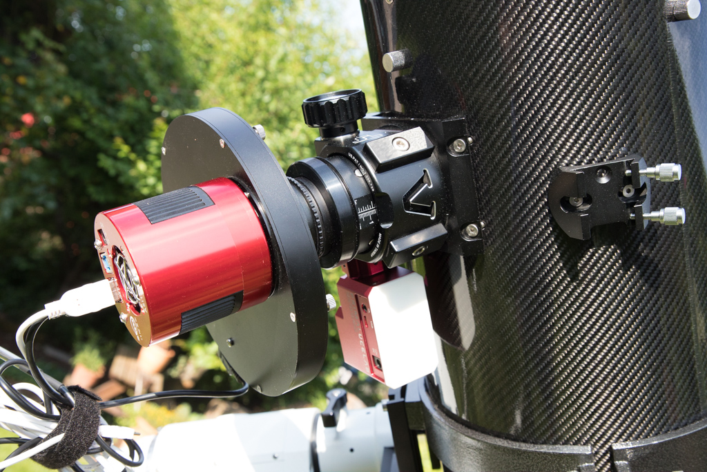 Auf dem nachfolgenden Bild ist die Ansicht des Okularauszugs zu sehen: Kamera (ZWO ASI 1600MM), Starlight-Express Filterrad (5 x 2"-Filter), und Sesto-Senso Fokussiereinheit.