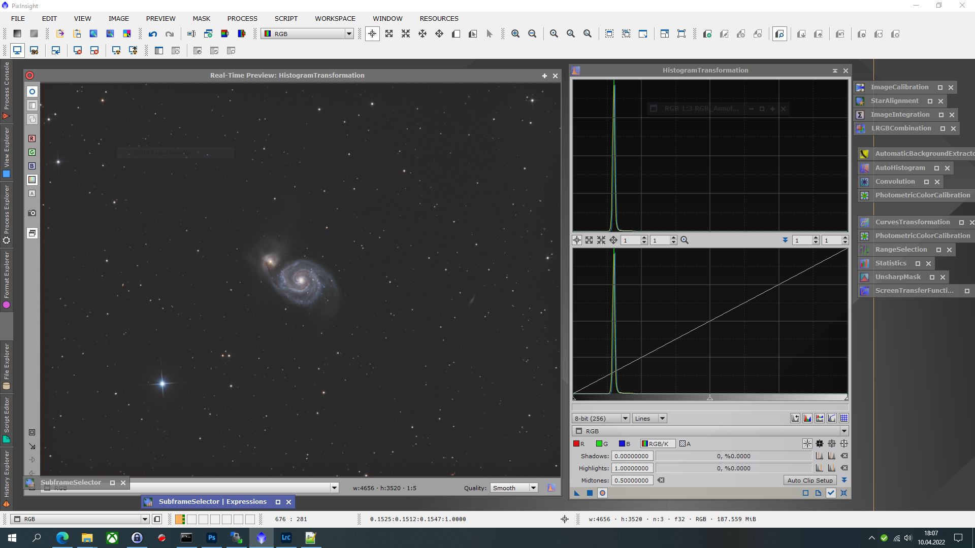 Damit werden die einzelnen Subframes kalibriert, ausgerichtet und integriert, sowie die einzelnen Farbkanäle (LRGB, H-Alpha, OIII) dann für das Gesamtbild zusammengesetzt.
