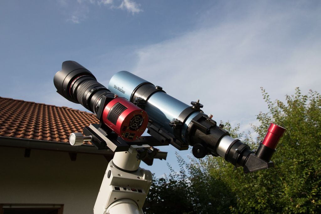 Auch hier erfolgt die Kontrolle der Nachführung (Guiding) über den Refraktor rechts im Bild. Insbesondere bei längeren Belichtungszeiten (z.B. bei H-Alpha Schmalbandaufnahmen), ist dies erforderlich.