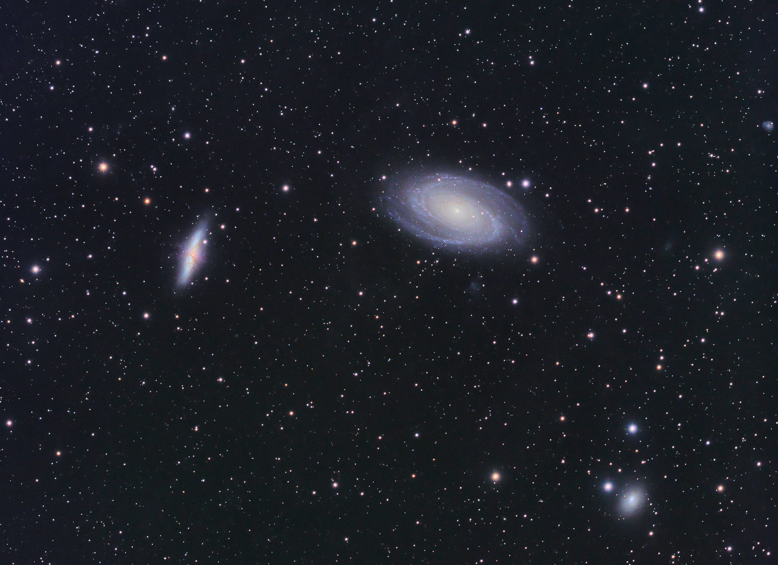 Messier 81 ist die Spiralgalaxie rechts, die längliche Galaxie auf der linken Seite ist M82.